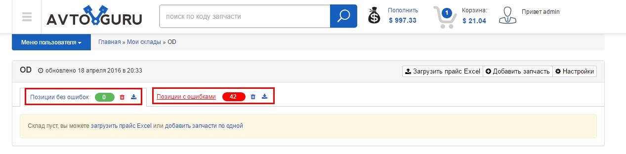 После импорта прайс-листа вы видите статистику импорта - количество корректных позиций и количество позиций не прошедшх проверку. Позиции без ошибок уже попали в общую базу и доступны в поиске.